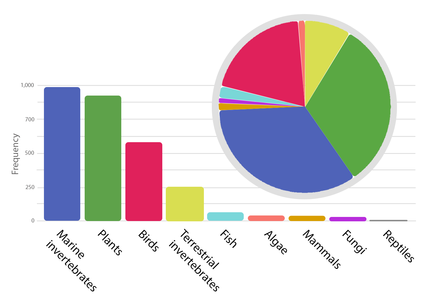 Plants were the second most observed category of biota, rivalling marine invertebrates with 924 observations for 32% of the dataset. These were collected entirely through iNaturalist by citizen scientists. However, iNaturalist is unreliable for plant identification, making it near impossible to give statistics on these species beyond the kingdom of “plantae” without introducing significant error and bias, to a level even unreached by any other group.
