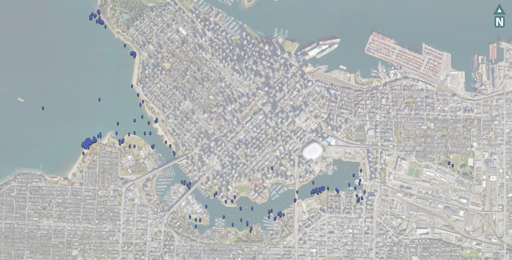 There are large gaps in knowledge regarding False Creek’s pollution. For example, the effects of 6PPD-Quinone on fish, specifically salmon, are being heavily studied across the west coast. The “tire-wear toxin” enters the waterways due to road runoff, where it is deposited by friction with car tires. 6PPD-Q causes the premature deaths of 40%-90% of juvenile salmon near roadways (Lo et al., 2023). It is known to also be fatal to other fish species, including trout and sturgeon. Roughly 165,000 people visit Granville island by car each year, and Granville bridge supports up to 65,000 motor vehicles per day (Granville Bridge Connector: Phase 1 Open House Information Displays, 2019; Granville Island 2040: Transportation Strategy, 2018). However, the concentration of 6PPD-Q in False Creek has yet to be officially studied. Similarly, there are gaps in knowledge surrounding the presence or abundance of Polychlorinated Biphenyls, persistent organic pollutants (POPs), Polycyclic Aromatic Hydrocarbons, heavy metals, and many other types of pollutants. Even the shape of the inlet is under debate; many sources (including municipal reports) ascribe the poor mixing to an underwater sill on the seafloor. Reports as recent as 2016 claim that the sill is under the Cambie Street Bridge, reducing the mean depth from 5m to 3m, and it is the primary cause of the lack of circulation between the two major basins of False Creek (Cummings, 2016). However, other sources (including bathymetric surveys) assert that the area under Cambie Street bridge is actually the deepest part of the creek, reaching depths of 10m or greater. The False Creek Friends Society measured the depth with an on-board depth sounder in May 2024 and confirmed it as roughly 10 metres deep, with no sign of a sill anywhere near the bridge.
